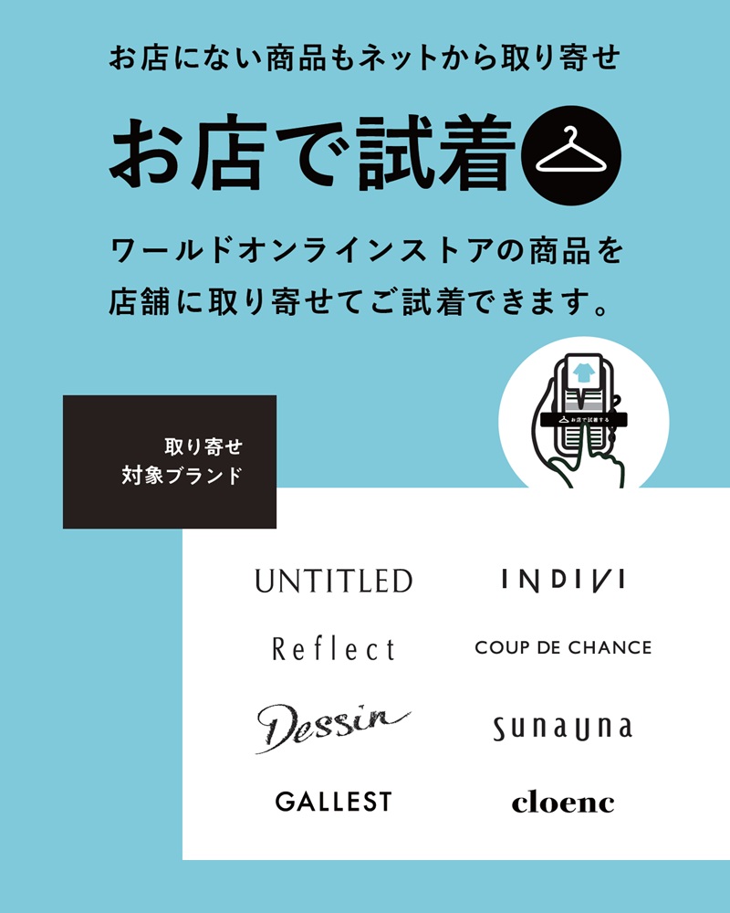 ワールドオンラインストアストアの一部商品を店舗に取り寄せてご試着できます。