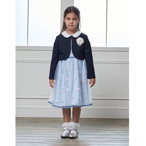 紺色のジャケットは襟付きで華やかさを演出します。
