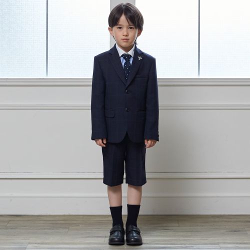 クラシカルな濃紺チェック地のジャケットとパンツは
