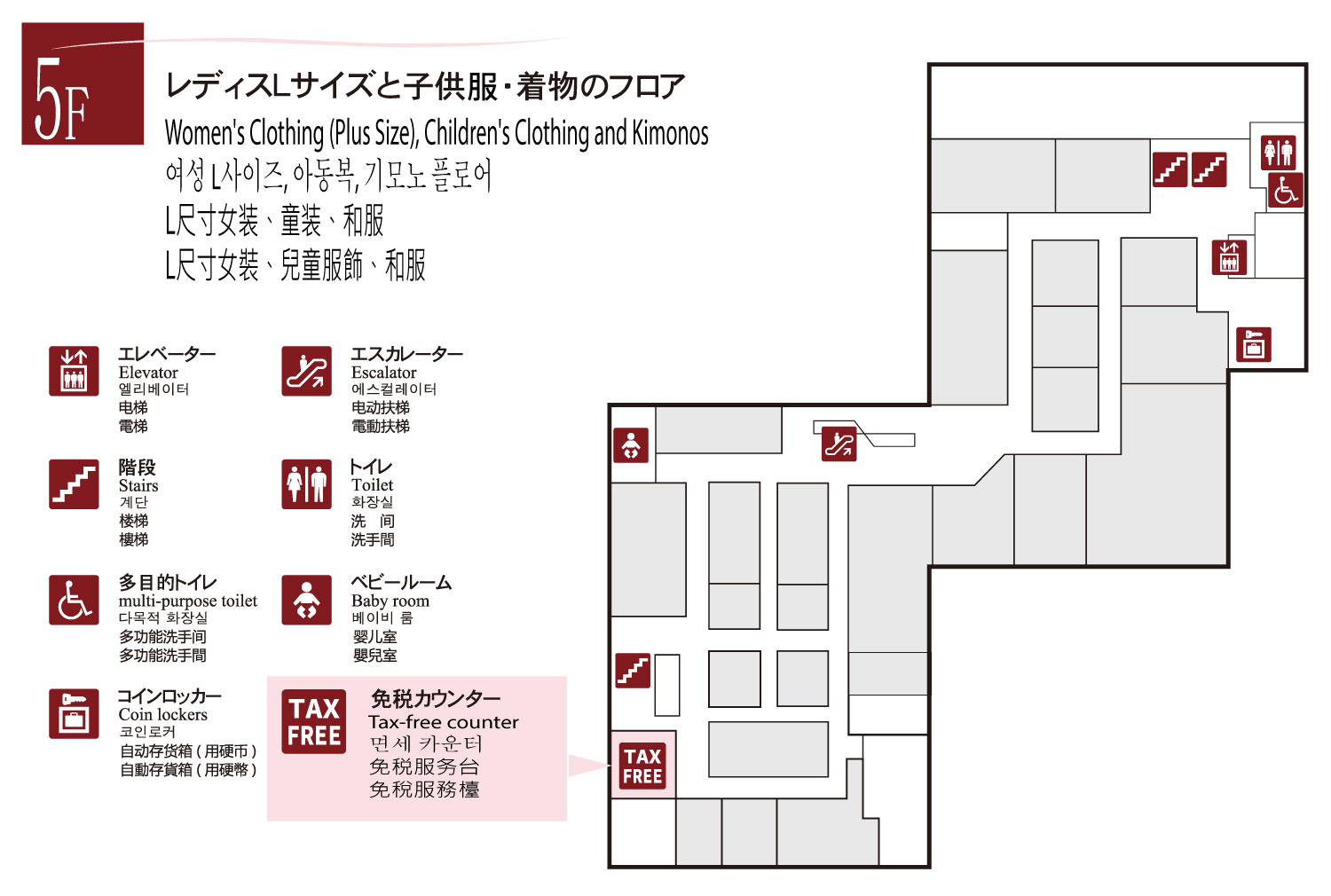 | 5层 | L尺寸女装、童装、和服层 | L尺寸女装、眼镜、童装、婴儿用品、和服、外销柜台、工艺美术沙龙、名牌收购店 | 名牌收购店 宝藏屋 |